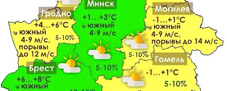 По Гродненской области: Облачно с прояснениями. Преимущественно без осадков. Ночью и утром местами слабые туман и гололед, на отдельных участках дорог гололедица. Ветер южный 4-9 м/с, местами порывы до 12 м/с. Температура ночью -3…+2°С, днем +2…+7°С.