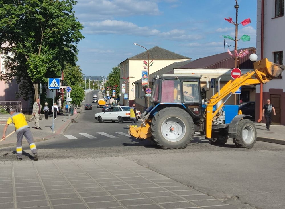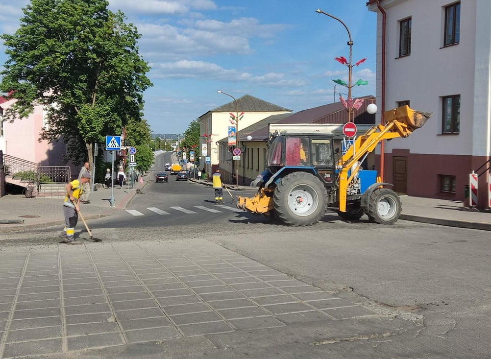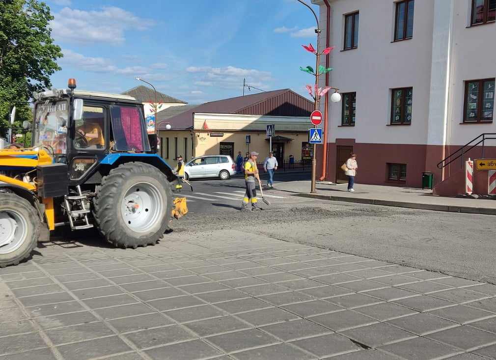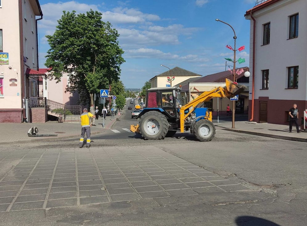 В центральной части Слонима идет ремонт дорожного покрытия. На улицах города замечена техника, занимающаяся укладкой нового асфальта и восстановлением дорожной инфраструктуры.