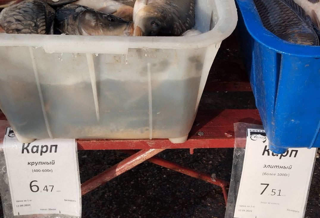 На рынке также продают живую рыбу: карась стоит 4,55 руб., толстолобик – 4,41 руб., карп – 6,47 руб., более крупный карп – 7,51 руб.