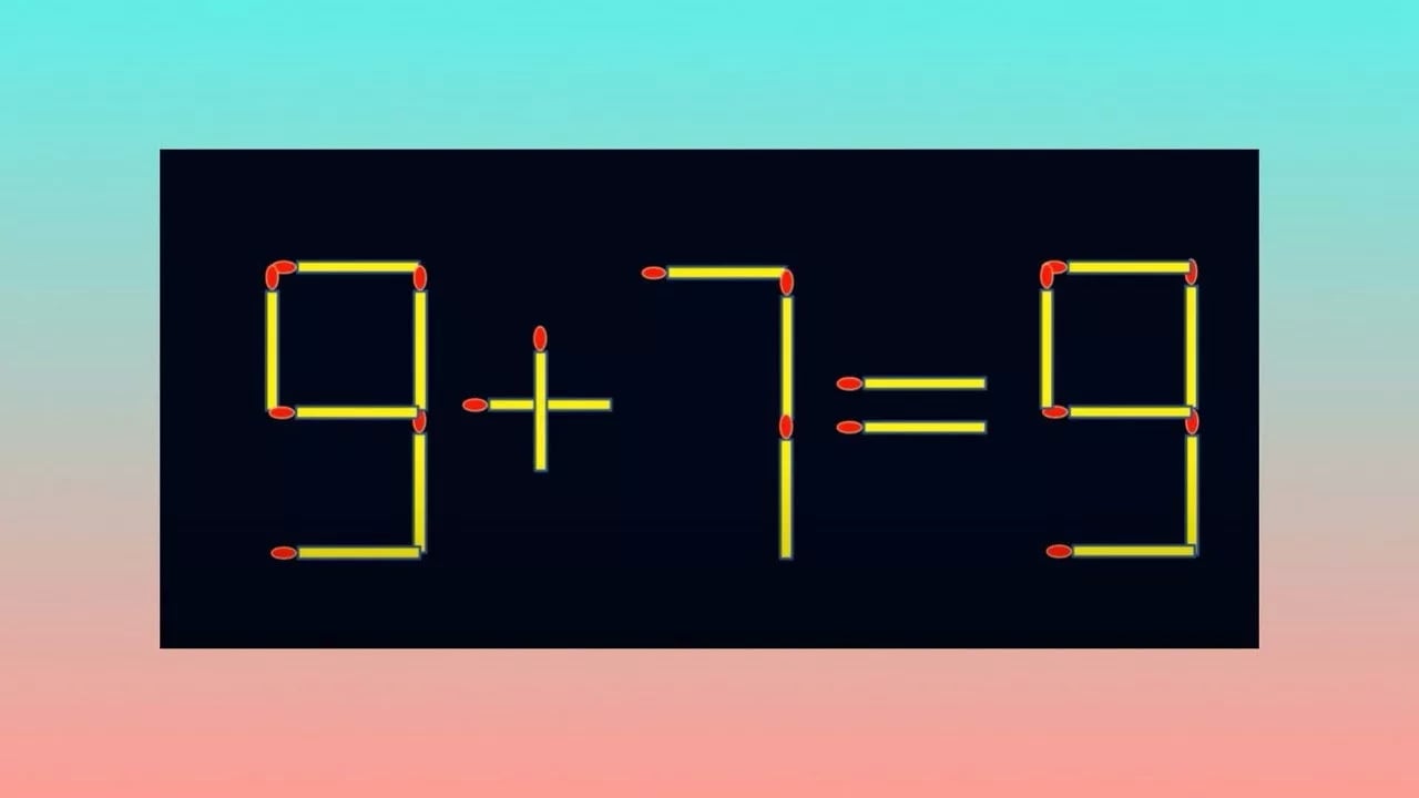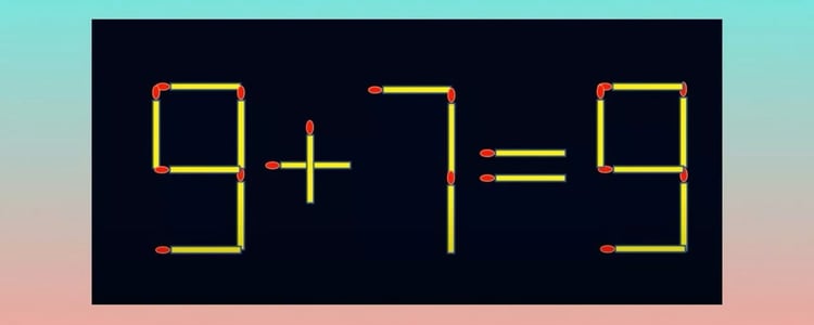 Попробуйте решить одну из таких задач! На картинке изображено неверное равенство: 9+7=9. Ваша задача — переместить только одну спичку, чтобы уравнение стало верным.