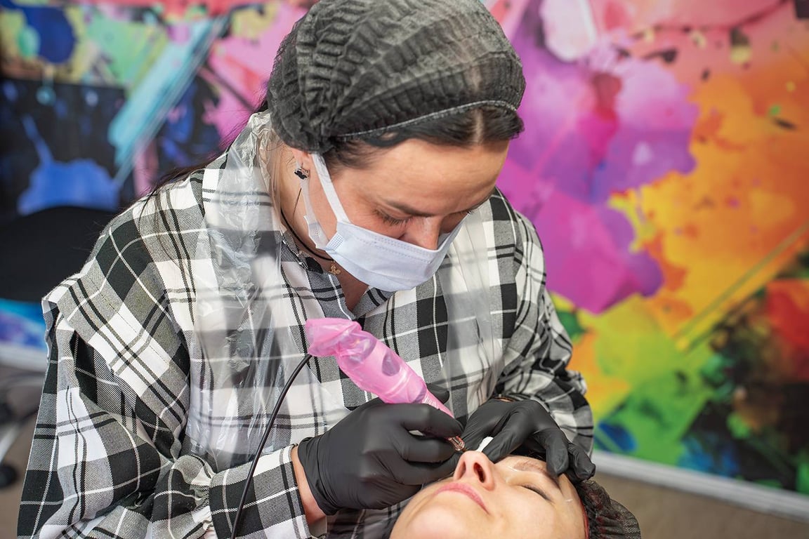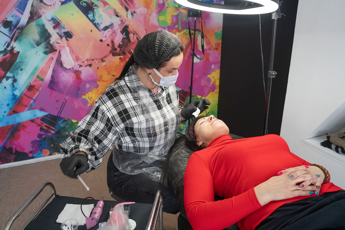 Ольгу застали за работой: она выполняла перманентный макияж бровей клиентке.