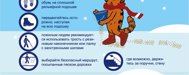 Обувь: Избегайте скользкой обуви на высоком каблуке. Выбирайте обувь с микропористой подошвой или специальной зимней обувью с хорошим сцеплением. Пожилым людям рекомендуется использование трости с резиновым наконечником или палки со специальными шипами.