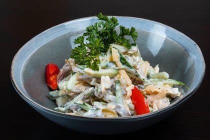 Этот салат готовится быстро и отлично подходит как для повседневного ужина, так и для праздничного стола. Он получается нежным, сытным и ароматным благодаря зелени и сыру.