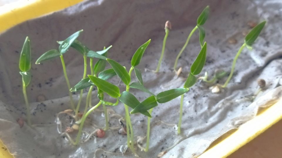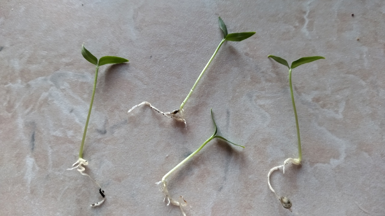 На третий день перцы уже можно сажать — семечко с корешком подхватываем зубочисткой или пинцетом и переносим в горшочки с землей. Петелька ростка или зеленые листья покажутся уже на 4-й день!