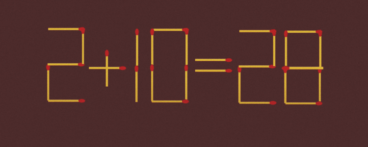 Наши головоломки способны приносить радость и увеличивать жизненную энергию. Убедитесь в этом на своем примере, решив такую задачу: 2+10=28. За 6 секунд нужно переставить одну спичку на «правильное» место.