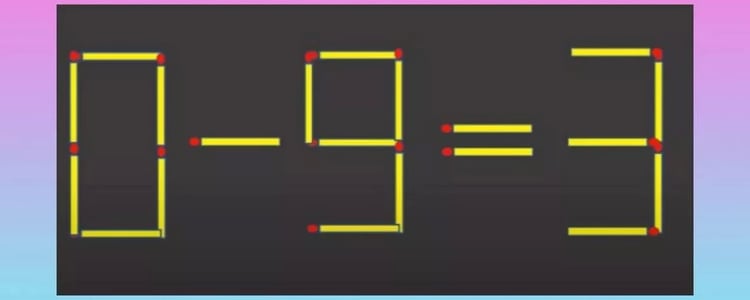 Перед вами математический пример, выложенный из спичек: 0−9=3. Очевидно, что он неверен. Ваша задача — передвинуть только одну спичку, чтобы равенство стало правильным.