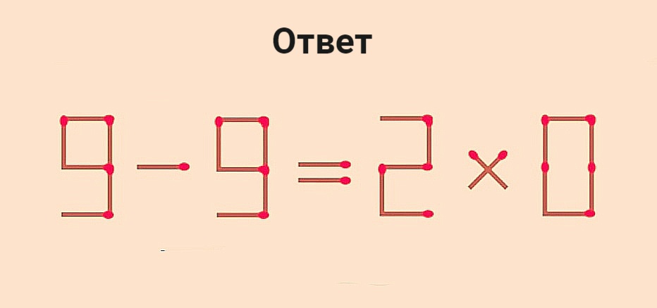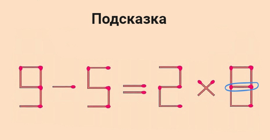 Пример 9–5=2×8 кто-то решил неправильно. Ваша задача — исправить ошибку: переставить 1 спичку так, чтобы равенство стало верным. Избавляться от спичек нельзя.