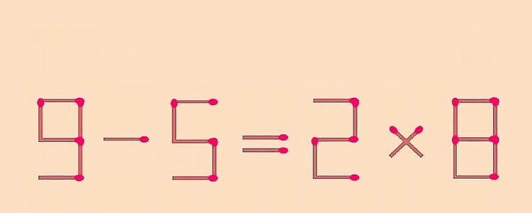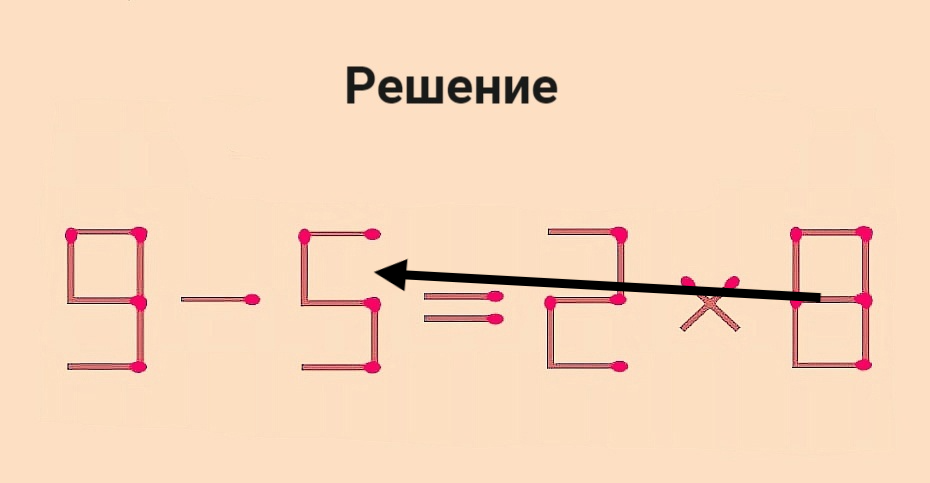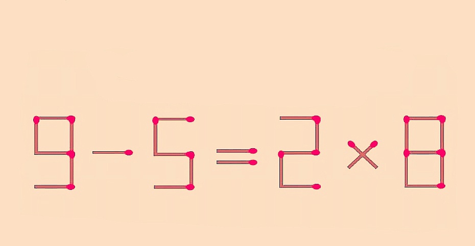 Переставьте 1 спичку, чтобы равенство 9–5=2×8 стало верным