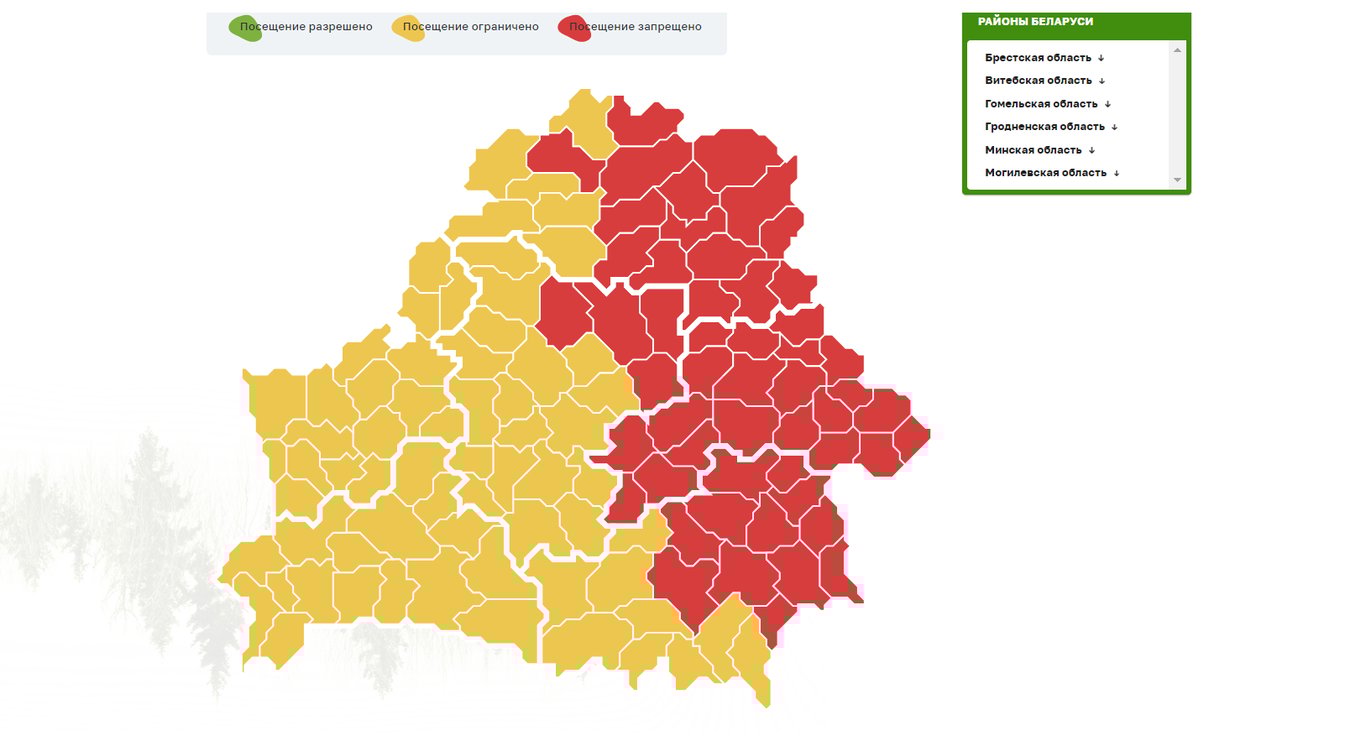 Чтобы встреча с природоохраной в лесу не закончилась профилактической беседой или даже штрафом, перед походом в лес сверьтесь с картой Минлесхоза. На 22 сентября она выглядит так.