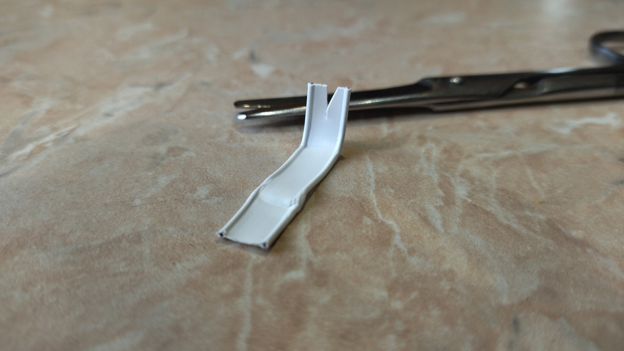 Сначала зажиму нужно придать форму инструмента, чтобы им было удобно пользоваться — например, выгнуть его в форме буквы «Г». Затем ножницами следует прорезать отверстие в виде галочки. Если клещ большой, то и отверстие нужно вырезать побольше.