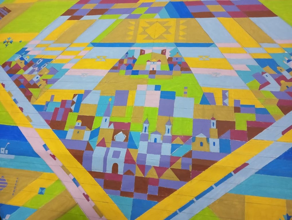 Как ранее писал volkovysk.org, гобелен имеет размеры 2 на 1,4 м. Центральное место занимают образы исторических жемчужин Гродненщины — Коложи, церкви-крепости Святого Михаила Архангела в Сынковичах, Старого замка в Гродно, Замковой горы в Новогрудке, а также Жировичского монастыря, Фарного костела в областном центре, другие исторические объекты. Как символы родной Беларуси цветут на полотне васильки, парят в небе аисты. Колорита композиции придают танцующие пары в национальных костюмах.
