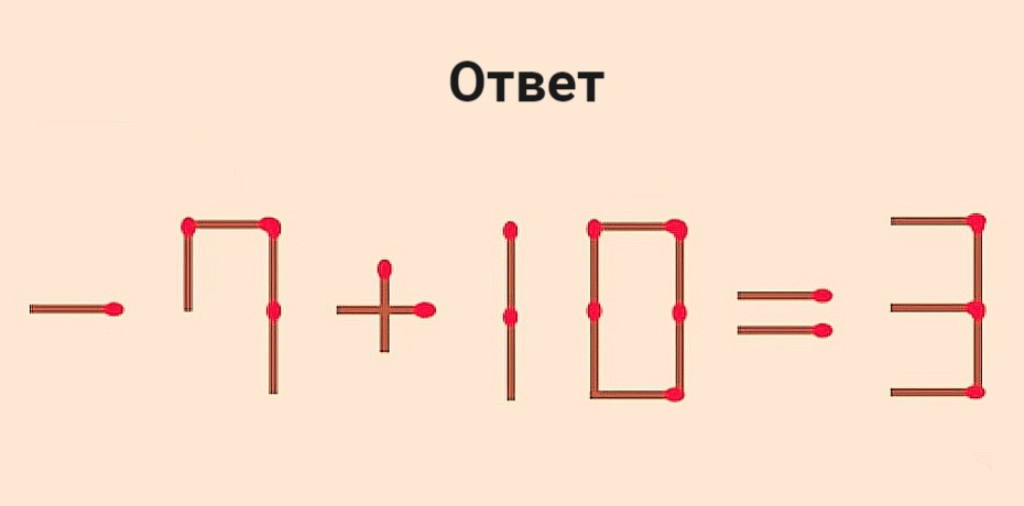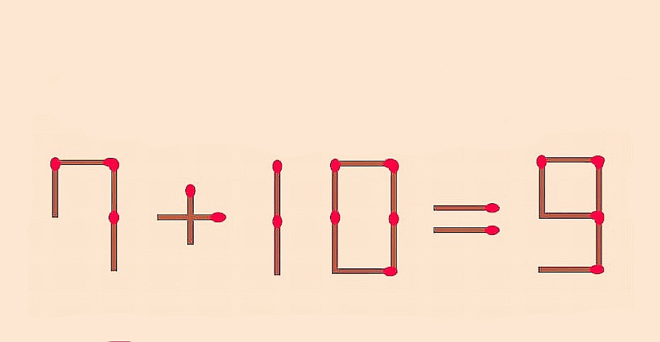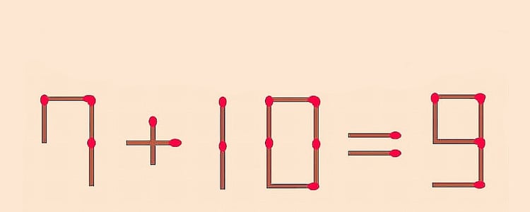 Хотите проверить, есть ли у вас такая смекалка? Тогда хорошо рассмотрите картинку с заданием и попробуйте решить 7+10=9, переставив в другое место только 1 спичку. Если сумеете это сделать за 11 секунд — вы, несомненно, обладаете этим природным даром.