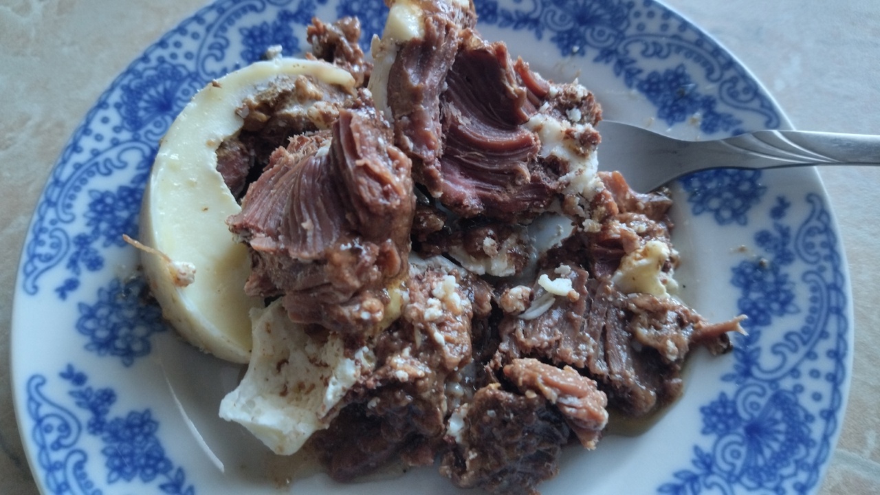 Как и заявлено на этикетке, консервы состоят из цельных кусочков. Волокнистая текстура тушенки сохраняется. При этом куски мяса при готовке легко распадаются на волокна.