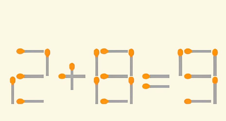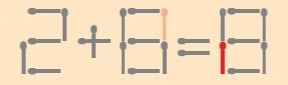 Чтобы решить сегодняшнюю головоломку, следует снять спичку с цифры 8, превратив ее в цифру 6, и приставить ее к цифре 9, чтобы получилась цифра 8: 2+6=8.