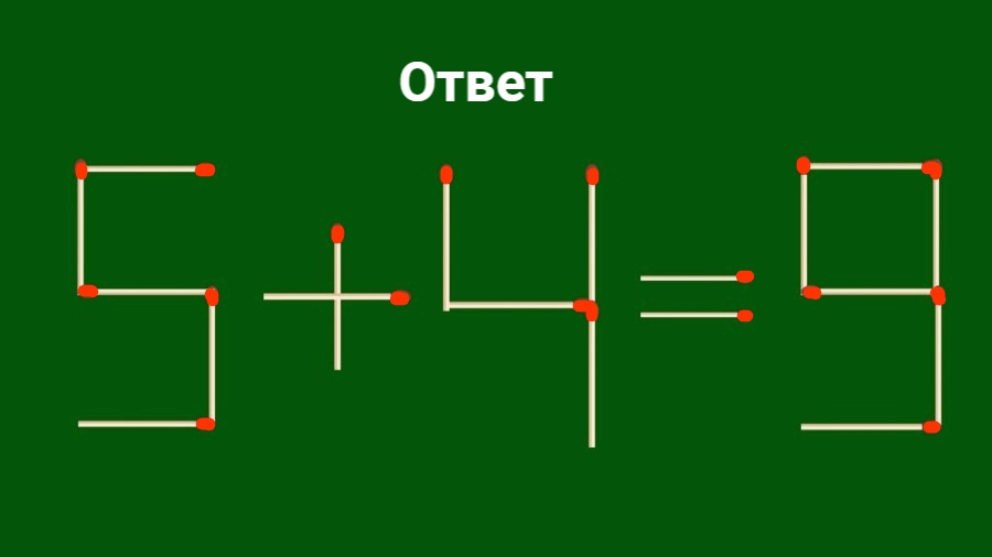 Если у вас не получилось преодолеть все хитросплетения спичек в головоломке, с удовольствием подскажем вам ответ. Увидите его чуть ниже. Возможно, более легкий пример натолкнет вас на ответ? Переходите по ссылке, решайте, тренируйтесь — и возвращайтесь в этой головоломке. Тогда вы точно сможете разобраться с заданием в два счета.