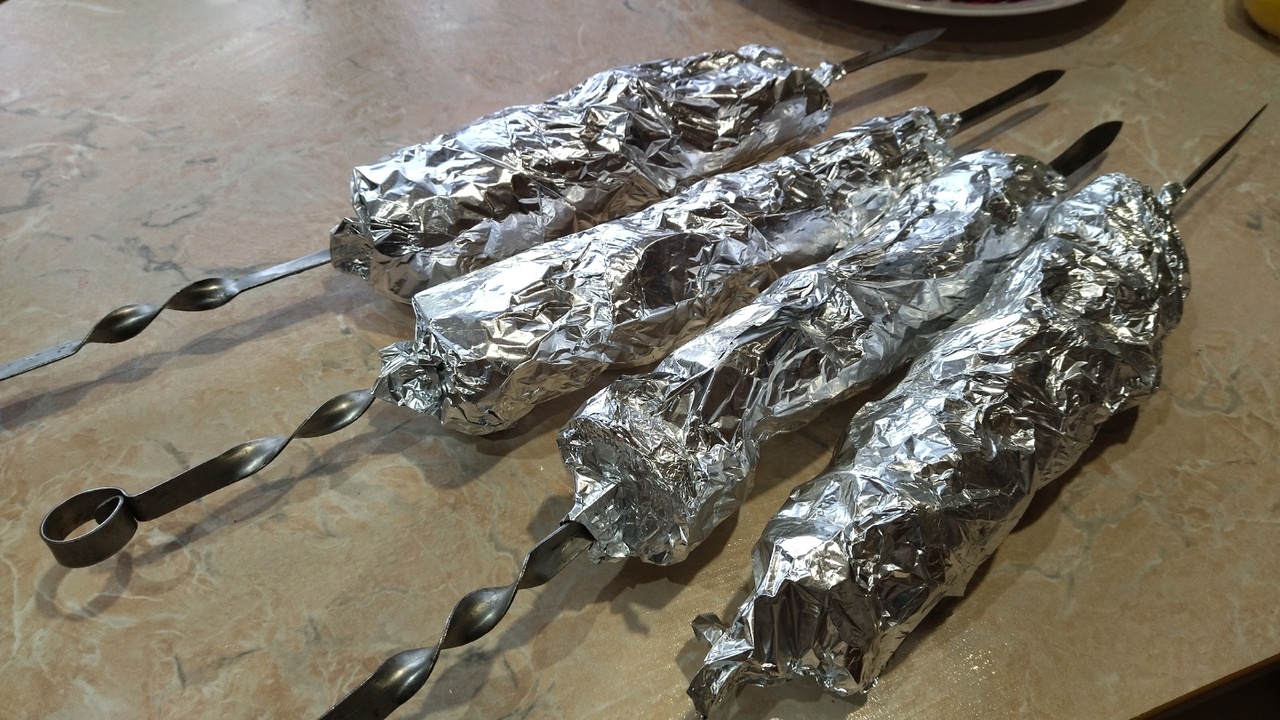 Оборачиваем шампур с картофельным шашлыком фольгой в один (!) слой, так чтобы все продукты были покрыты фольгой.