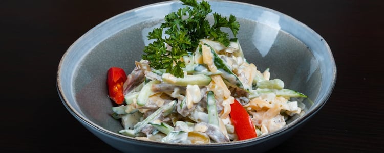 Этот салат готовится быстро и отлично подходит как для повседневного ужина, так и для праздничного стола. Он получается нежным, сытным и ароматным благодаря зелени и сыру.