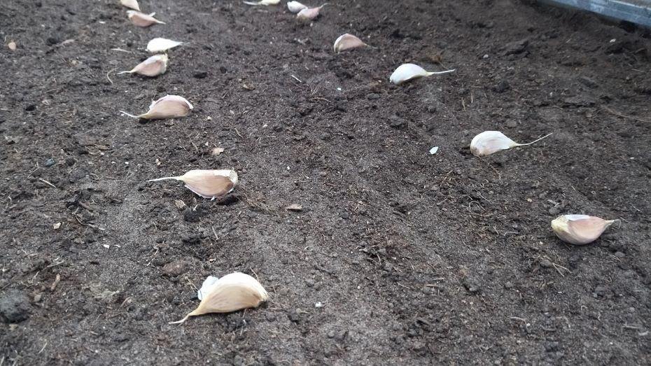 А вся хитрость вот в чем. Мы не сажаем зубки чеснока в землю. Просто раскладываем их по земле — как зубки лягут, так и хорошо. Раскладываем двумя длинными рядами, на длину огорода. Почву практически в огороде не копаем, так как все мульчируем травой.