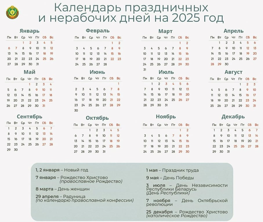 А затем наступит длинная череда праздничных дней. На православное Рождество белорусы будут отдыхать четыре дня подряд — 4, 5, 6 и 7 января (суббота, воскресенье, понедельник и вторник).