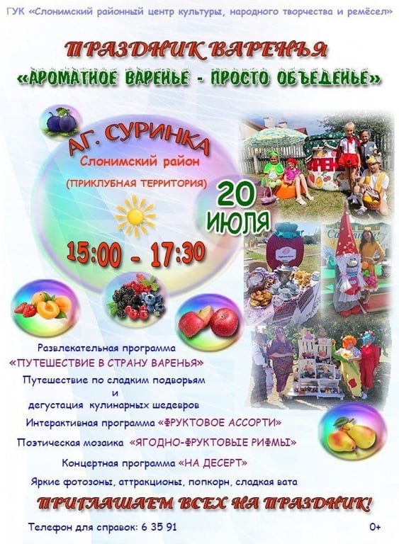 Праздник варенья «Ароматное варенье — просто объеденье» пройдет в субботу, 20 июля, с 15 до 17.30 на приклубной территории в агрогородке Суринка Слонимского района.
