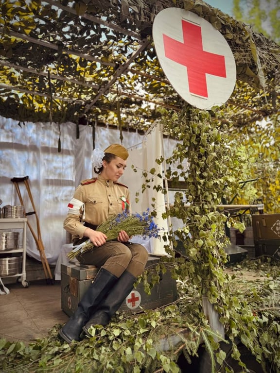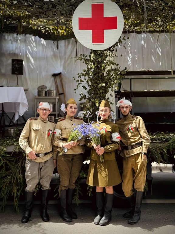 – Мы постарались воссоздать полевой госпиталь. О том, каким он был в Великую Отечественную, нам известно по архивным фотоснимкам, кадрам из исторических фильмов, рассказам ветеранов. И это счастье, что вот уже нескольким поколениям не довелось видеть войну воочию, – рассказал педиатр Слонимской ЦРБ, профсоюзный блогер Ангелина Юрчак, которая в инсталляции исполнила роль военного врача.