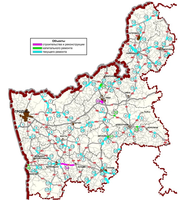 Карта-схема участков республиканских автомобильных дорог, планируемых к проведению дорожных работ в 2024 году в Гродненской области
