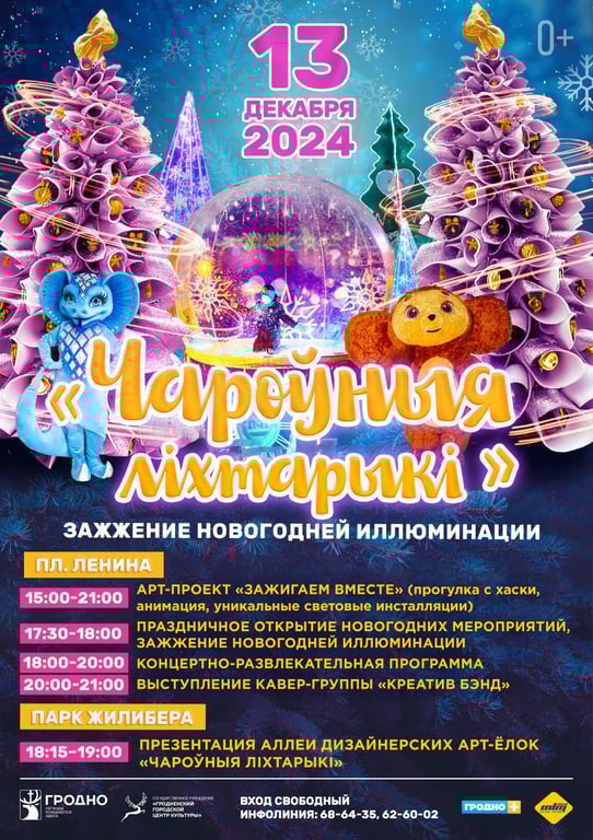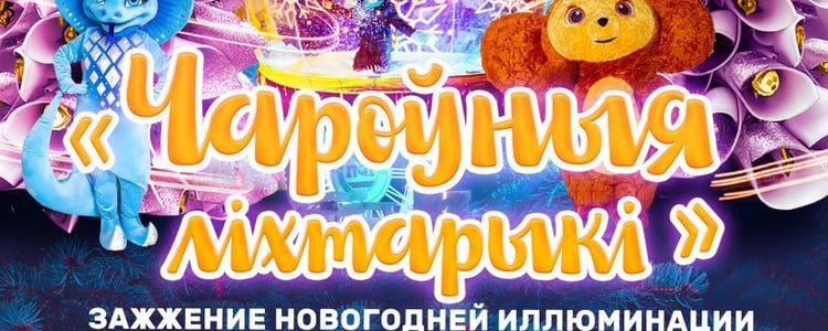 В программе «Чароўныя ліхтарыкі»: ▫️интерактивная площадка с живыми хаски, Чебурашкой, 4-метровой змеёй и другими персонажами; ▫️аллея дизайнерских арт-ёлок; ▫️ зажжение огней на ёлке на площади Ленина; ▫️флешмоб с бенгальскими огнями; ▫️концерт.