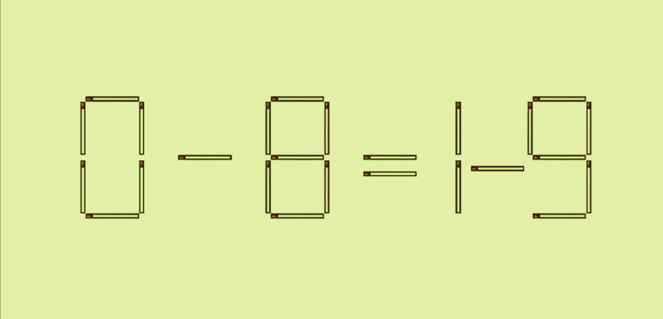 Для решения от цифры 8 отнимаем спичку и ставим ее в качестве знака «минус» между цифрами 1 и 9. Ответ: 0–8=1–9 (–8=–8).