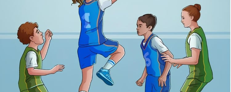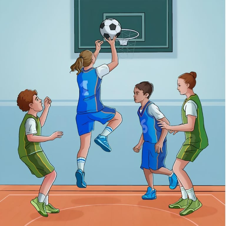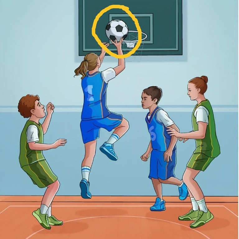 На картинке изображена группа детей, играющих в баскетбол в спортзале. В сцене участвуют четыре игрока, разделенные на две команды. Девушка в синей форме под №1 показана в момент заброса мяча в баскетбольную корзину. Все элементы, как кажется на первый взгляд, указывают на обычную игру в баскетбол.
