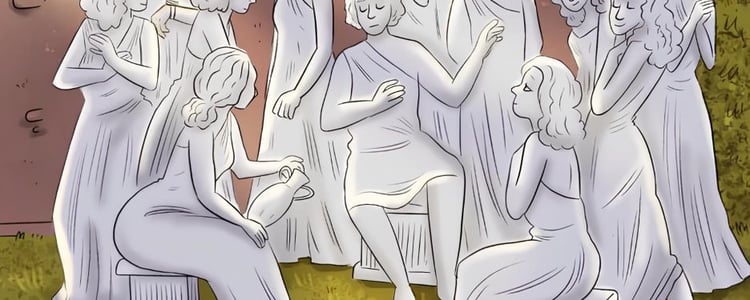 На картинке ниже изображен сад с группой фигур. Все они статны на вид, одеты в древнеримские тоги. Некоторые из фигур изображены стоя, другие сидят в позах, характерных для классического искусства. Предметы мебели и быта, стена на заднем плане картины переносят нас в Древний Рим.