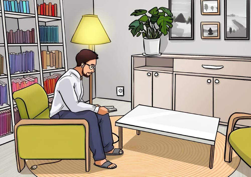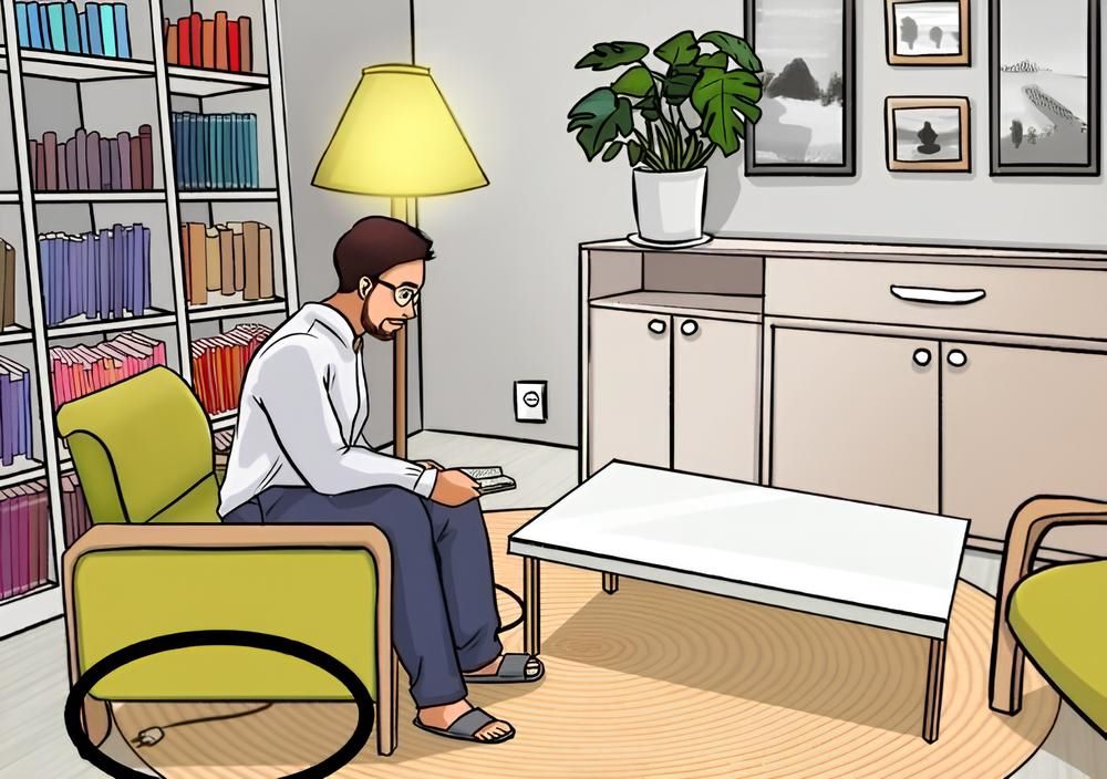 На картинке изображена уютная гостиная. Мы видим мужчину, сидящего в зеленом кресле с книгой в руках. В комнате из мебели есть белый журнальный столик, шкаф в глубине комнаты, торшер и книжная полка, заставленная книгами с яркими обложками. На комоде стоит растение в горшке, висят картины.
