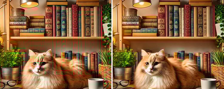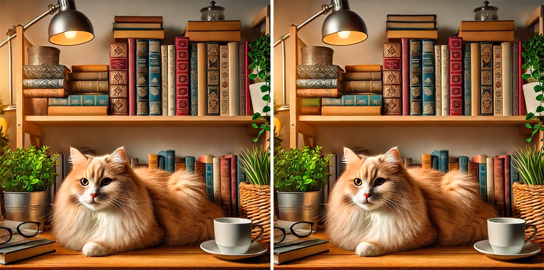 Он удобно устроился на полке, окружённой книгами, и, кажется, с интересом наблюдает за вами. Но не всё так просто: между этими двумя изображениями скрываются три отличия!