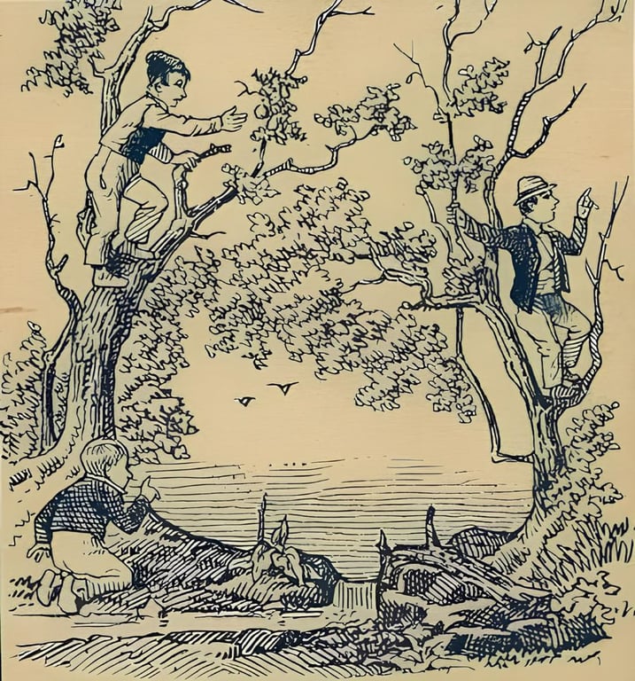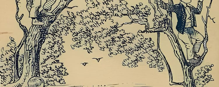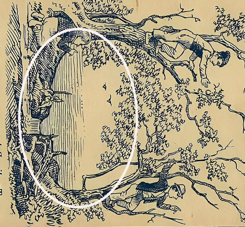 На картинке вы сразу заметите троих мужчин. Двое из них, сидя на дереве, ломают ветки. Третий работник находится на земле, рядом со стволом дерева.