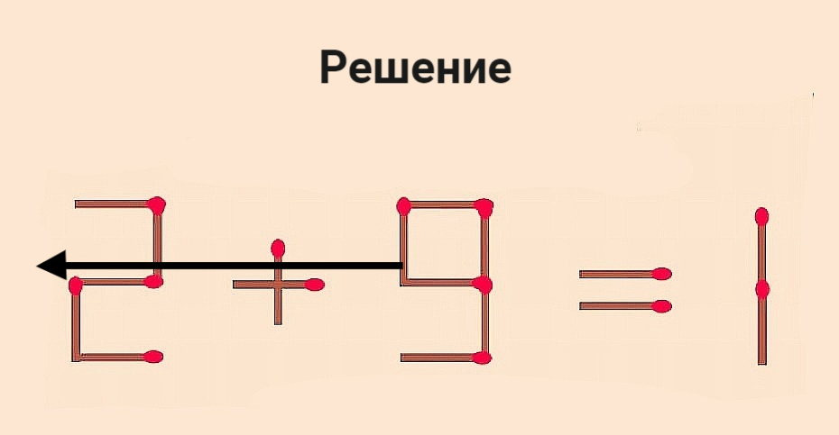 Решается эта головоломка так: цифру 9 преобразуем в цифру 3, а спичку кладем перед цифрой 2.