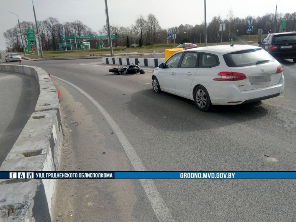 У 13.22 на колавай развязцы вуліц Дзяржынскага і Мясніцкай сутыкнуліся легкавік «Peugeot» і матацыкл «Kawasaki».