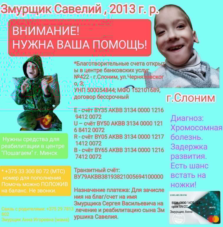 Для матери самое главное, чтобы ее дети были здоровы и счастливы. А когда ребенок заболевает или рождается с патологией, она делает все возможное и невозможное, чтобы ему помочь. Великая вера и любовь творят чудеса. Примером такой борьбы являются жители Слонима Анна Змурщик и её супруг Сергей, которые уже двенадцать лет борются за здоровье своего сына Савелия.