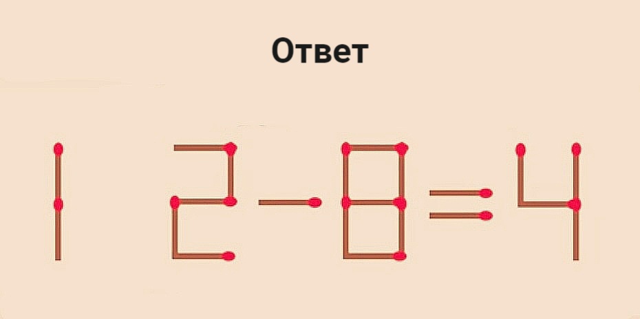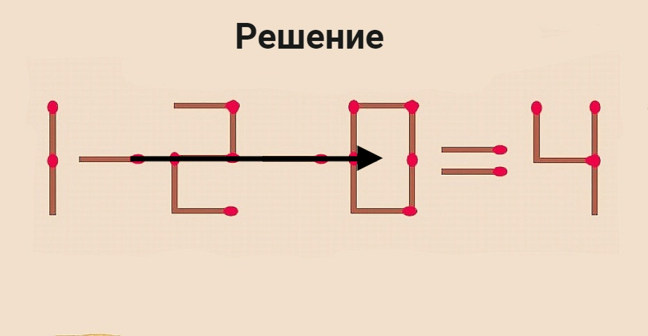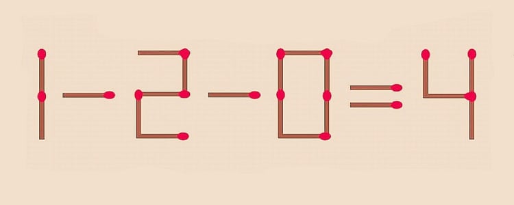 Не скажем, что сегодняшняя головоломка легкая, но и сложной ее не назовешь. Вы удивитесь, как просто она решается. Условие то же: нужно переложить на другое место 1 спичку, чтобы пример стал верным: 1-2-0=4. Если управитесь за 10 секунд — у вас уникальный склад ума, можете не сомневаться!
