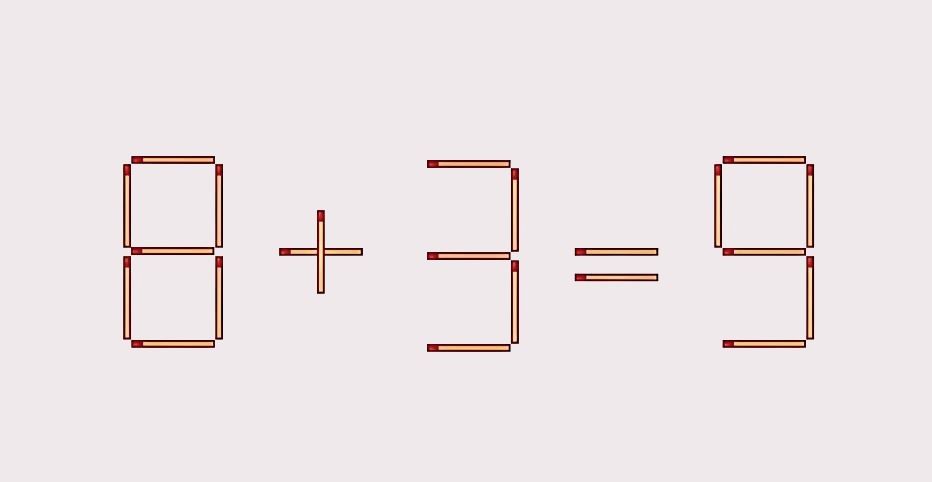Хотите сегодня проверить свою зоркость ума? Тогда сядьте поудобнее — и попробуйте за 20 секунд разгадать такую головоломку: в неверно решенном равенстве 8+3=9 нужно переставить 1 спичку, чтобы оно стало верным.