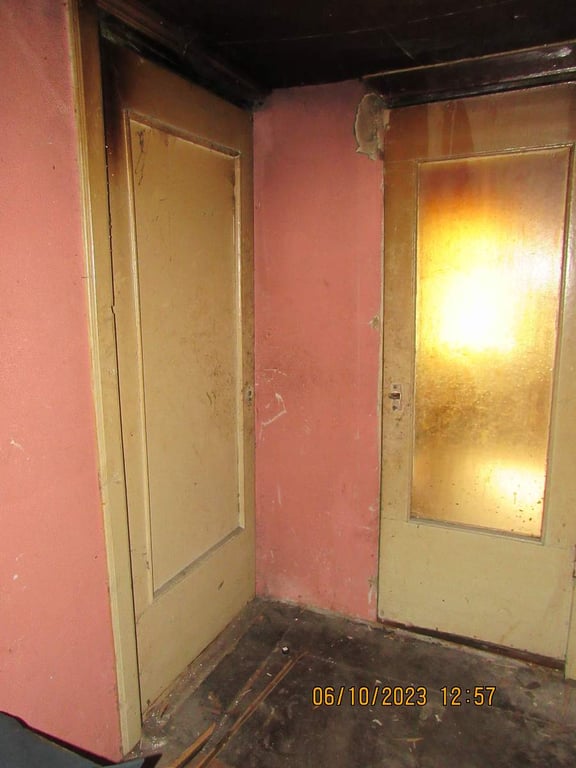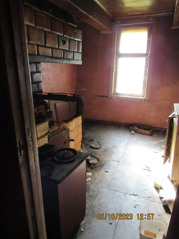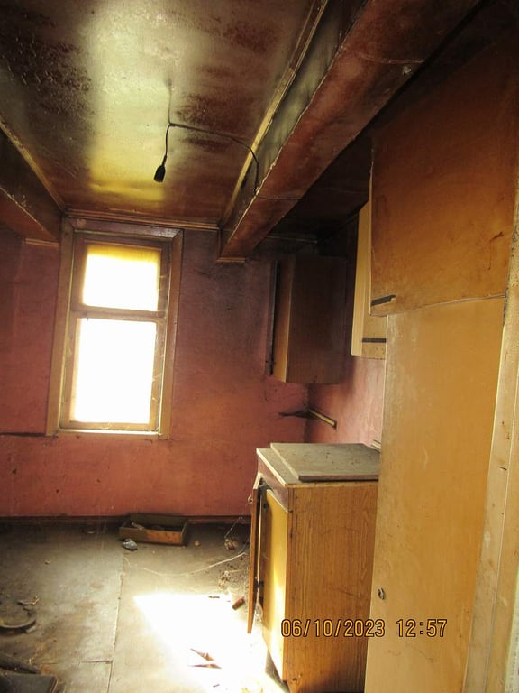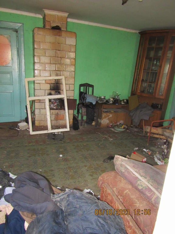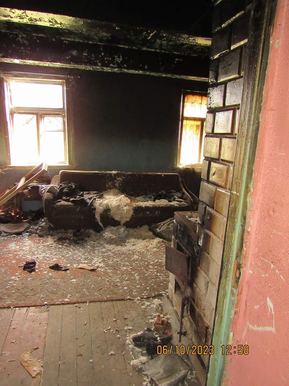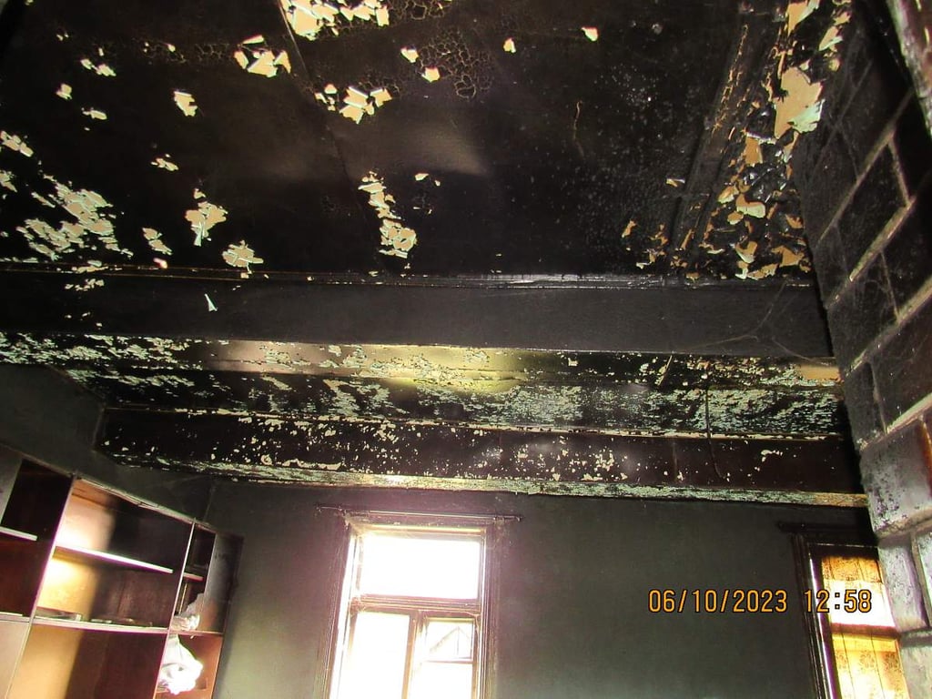 Площадь жилого дома — 72 м кв. Он поделен на две комнаты и кухню. Как видно на фото, в доме был пожар и пострадал потолок в одной из комнат.