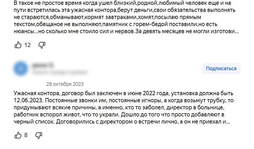 Сроки установки памятников постоянно оттягивались, работа выполнялась некачественно, а возмущенным клиентам деньги не возвращались. Многочисленные жалобы в адрес директора должного эффекта не возымели, лишь создавалась видимость проведения работ, но до конца обязательства не исполнялись.