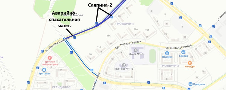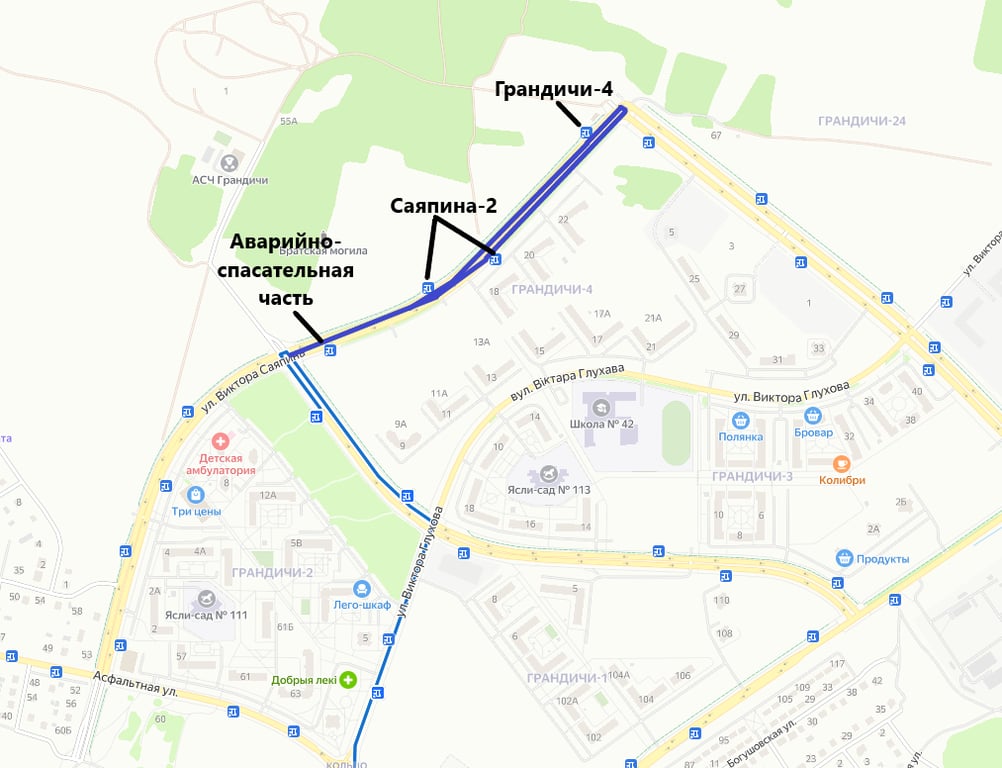остановочный пункт «Грандичи-4» – ул. Виктора Саяпина – ул. Валентины Макаровой и далее по своему маршруту без изменений.