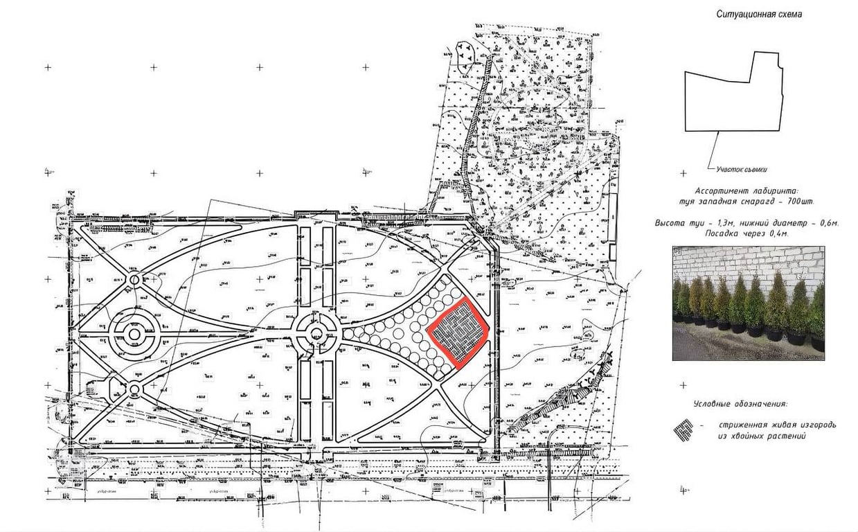 Для лабиринта выбрали быстрорастущий и менее прихотливый вид туй – Смарагд. Всего высадят 700 деревьев высотой 1,3 м.