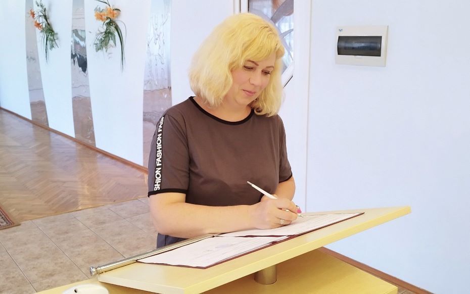 Начальник отдела Татьяна Гермось поздравила счастливых родителей с прекрасным семейным праздником, вручила первый государственный документ сына — свидетельство о рождении в обложке с государственной символикой, памятную медаль.