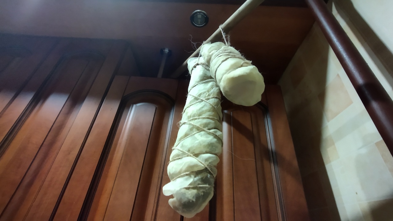 5) Заворачиваем полендвицу в марлю или тюль. Обвязываем веревочкой и подвешиваем сушиться на кухне где-нибудь повыше.