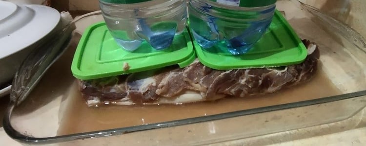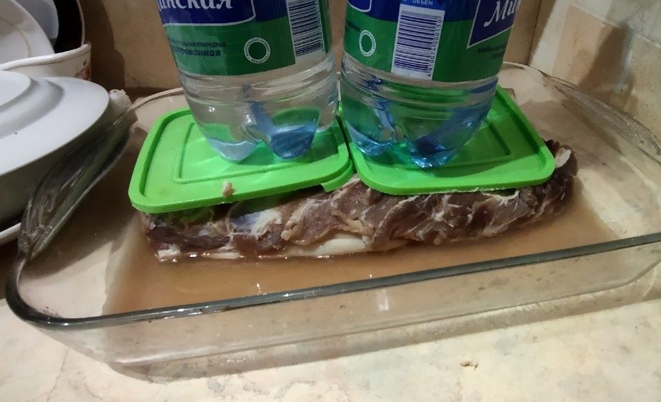 3) Сверху на мясо кладем гнет — можно использовать бутылки или 3-литровые банки с водой. Под гнетом мясо должно стоять на кухне (в холодильник убирать не надо!). Один раз в день переворачиваем. Из мяса будет вытекать жидкость.