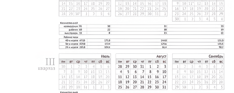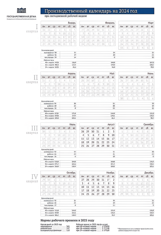 В нём приводится норма рабочего при 40-, 36- и 24-часовой рабочих неделях. Также указано количество рабочих и выходных дней при 5-дневной рабочей неделе с двумя выходными днями.