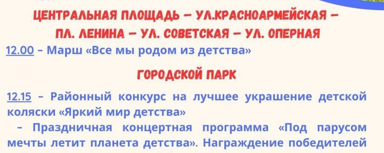 В программе праздника — марш «Все мы родом из детства», районный конкурс на лучшее украшение детской коляски, праздничная концертная программа.