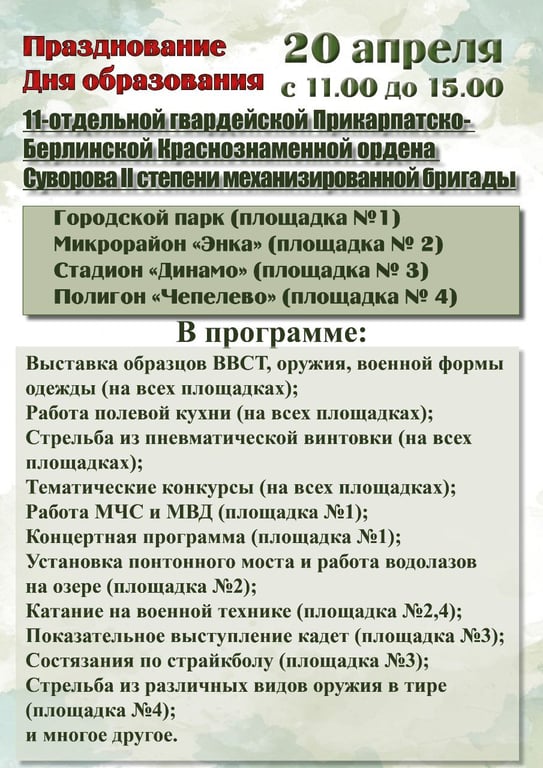 Праздничные мероприятия будут проходить с 11 до 15 часов на четырех площадках — в городском парке, в микрорайоне Энка, на стадионе «Динамо» и полигоне «Чепелево», сообщает телеграм-канал бригады.