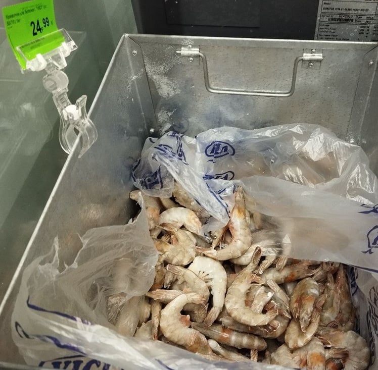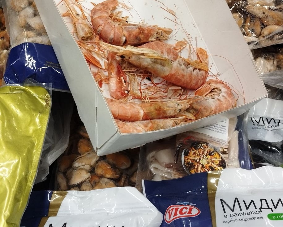 В продаже также есть креветки по цене от 26,99 до 24,99 руб., мясо креветок стоит от 49,47 до 51,96 руб., коктейль из морепродуктов – 43,96 руб.