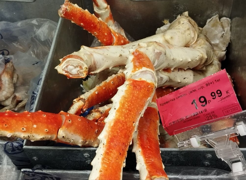 Недавно в одном из магазинов появилась еще одна новинка – камчатский краб, а точнее, его конечности. Их стоимость — 99,99 рубля за килограмм.
